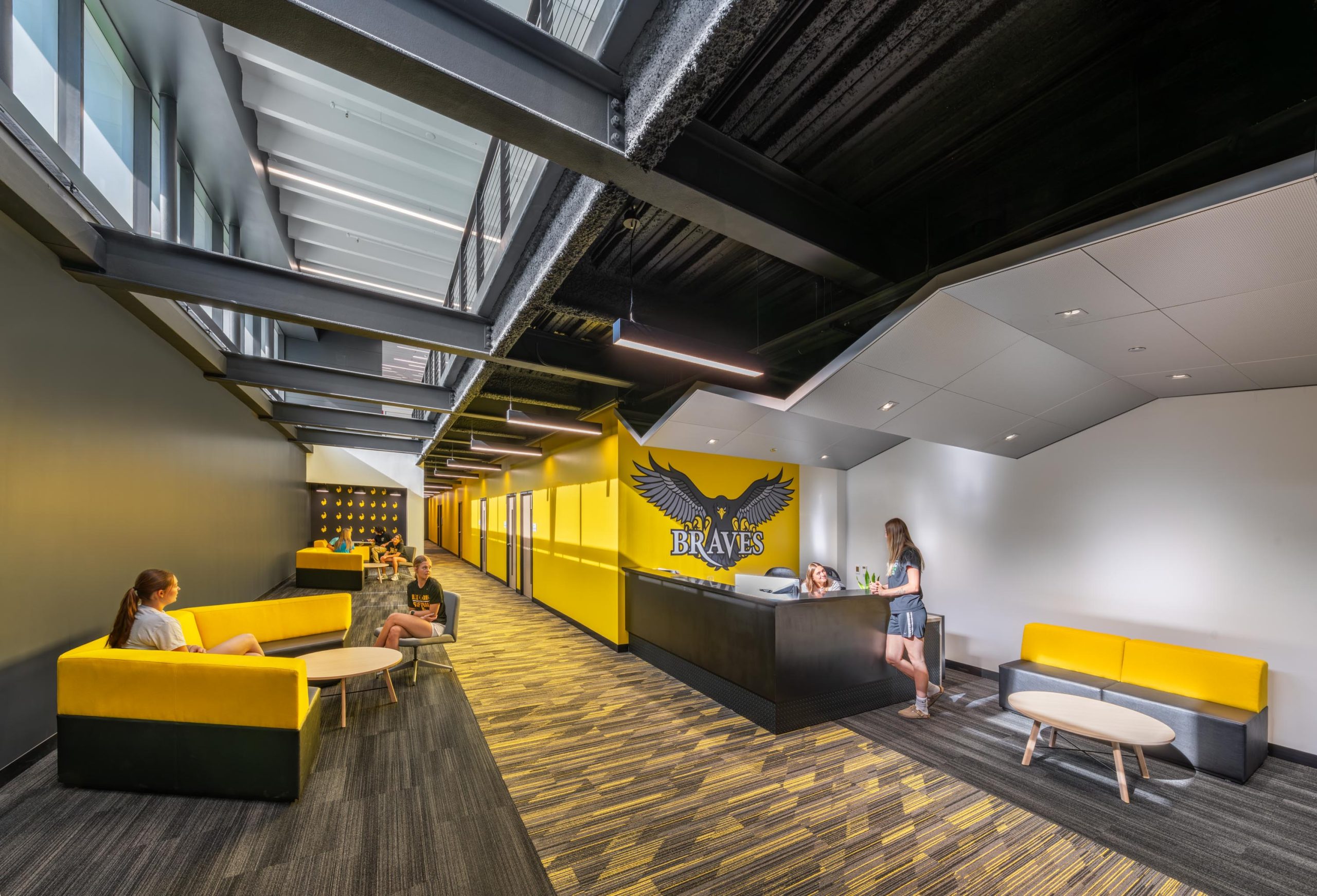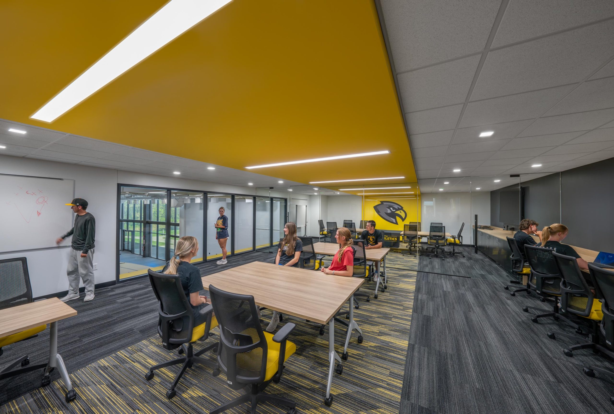 The athletic office area houses the director of athletics, administrative assistant, head coaches and assistant coaching staff. Soft seating and an open layout help create a professional yet approachable space for athletes and visitors.