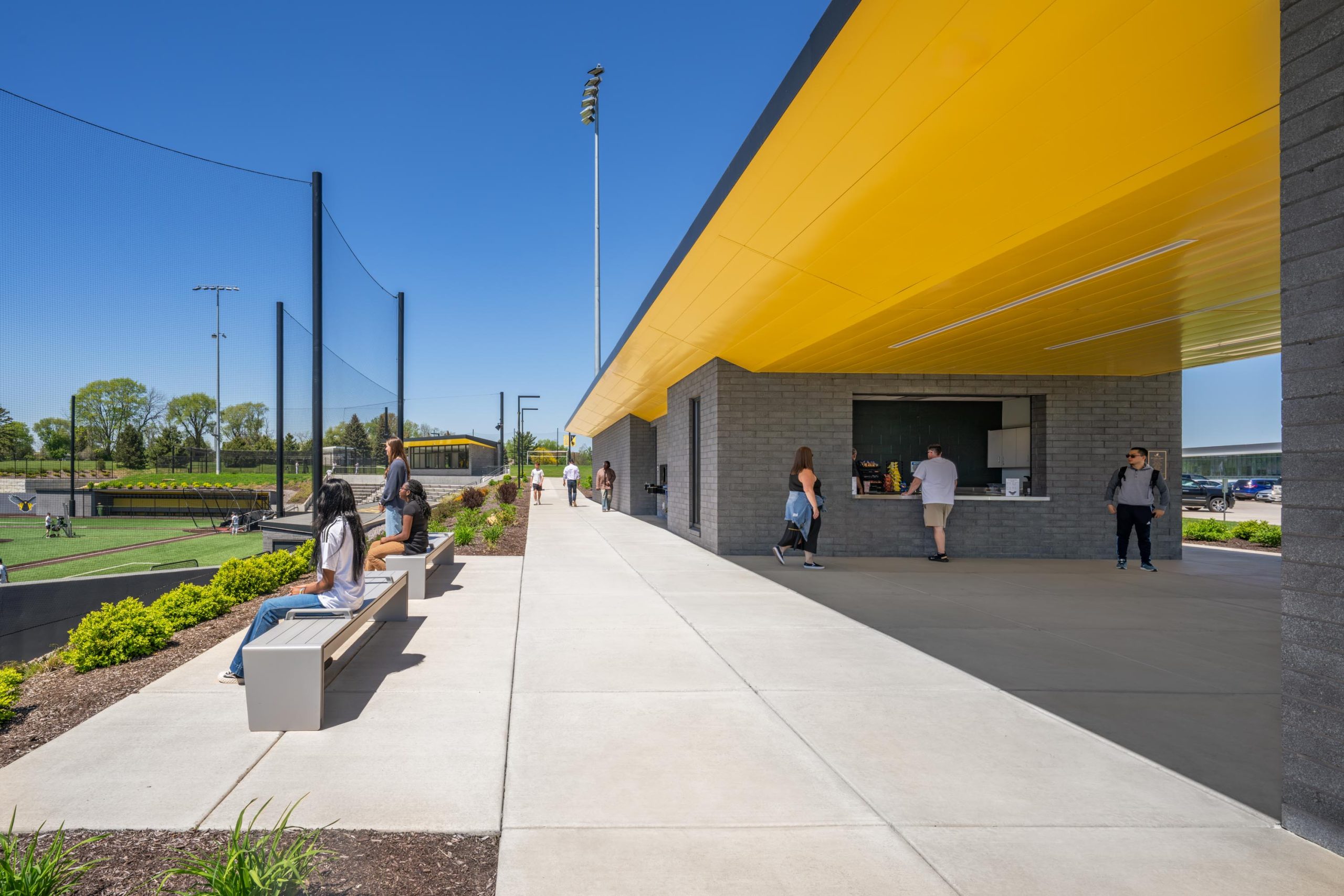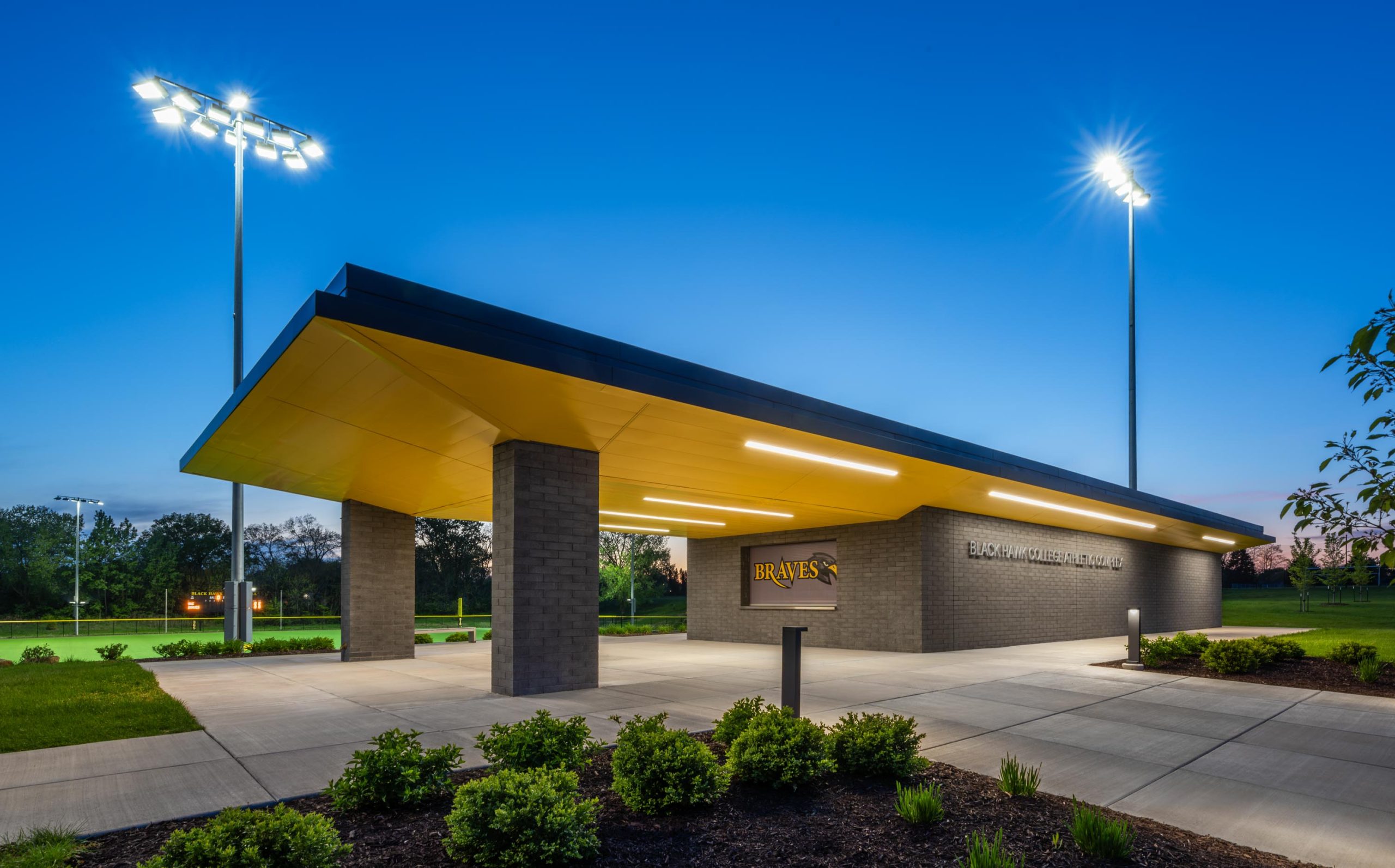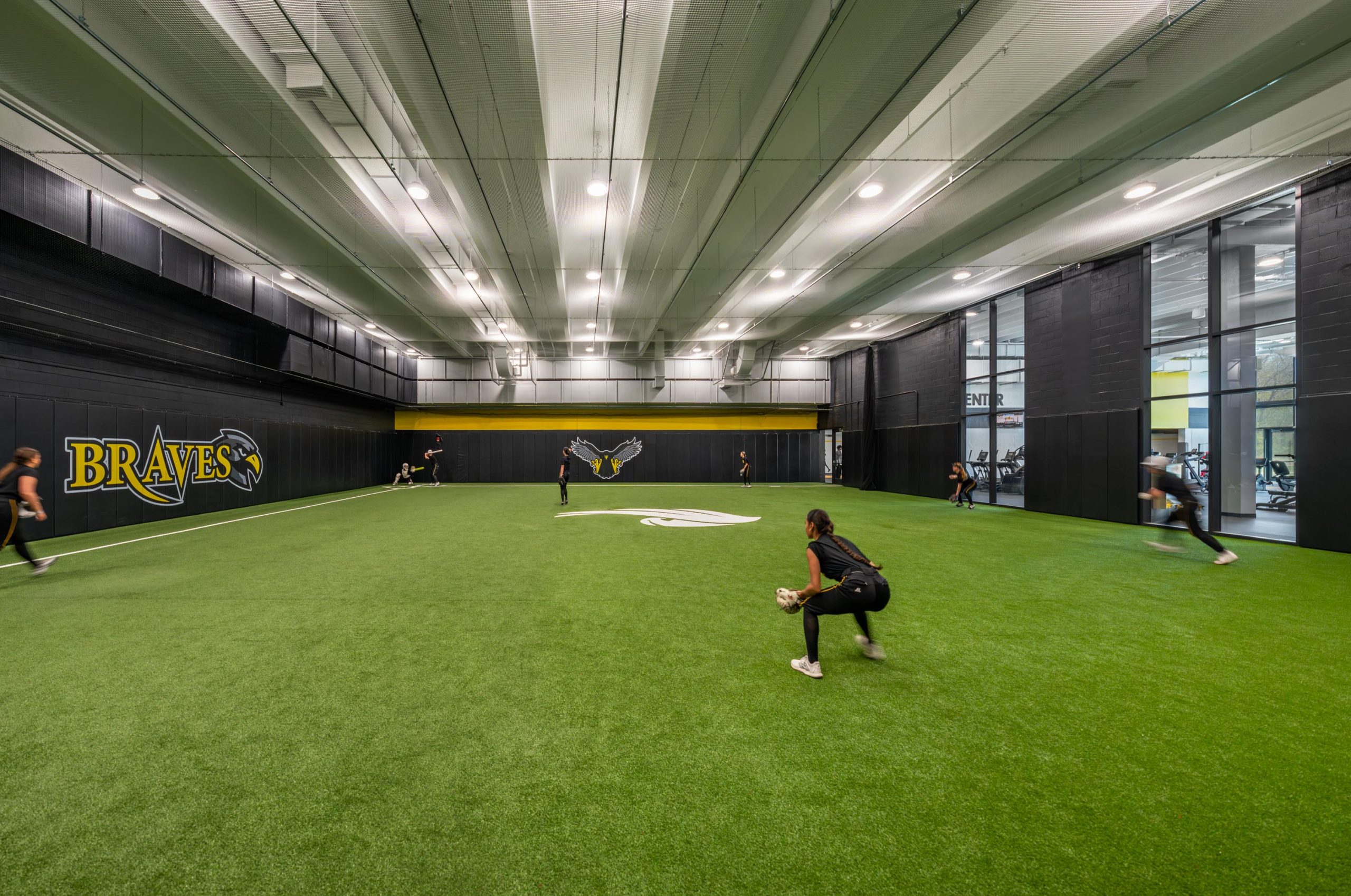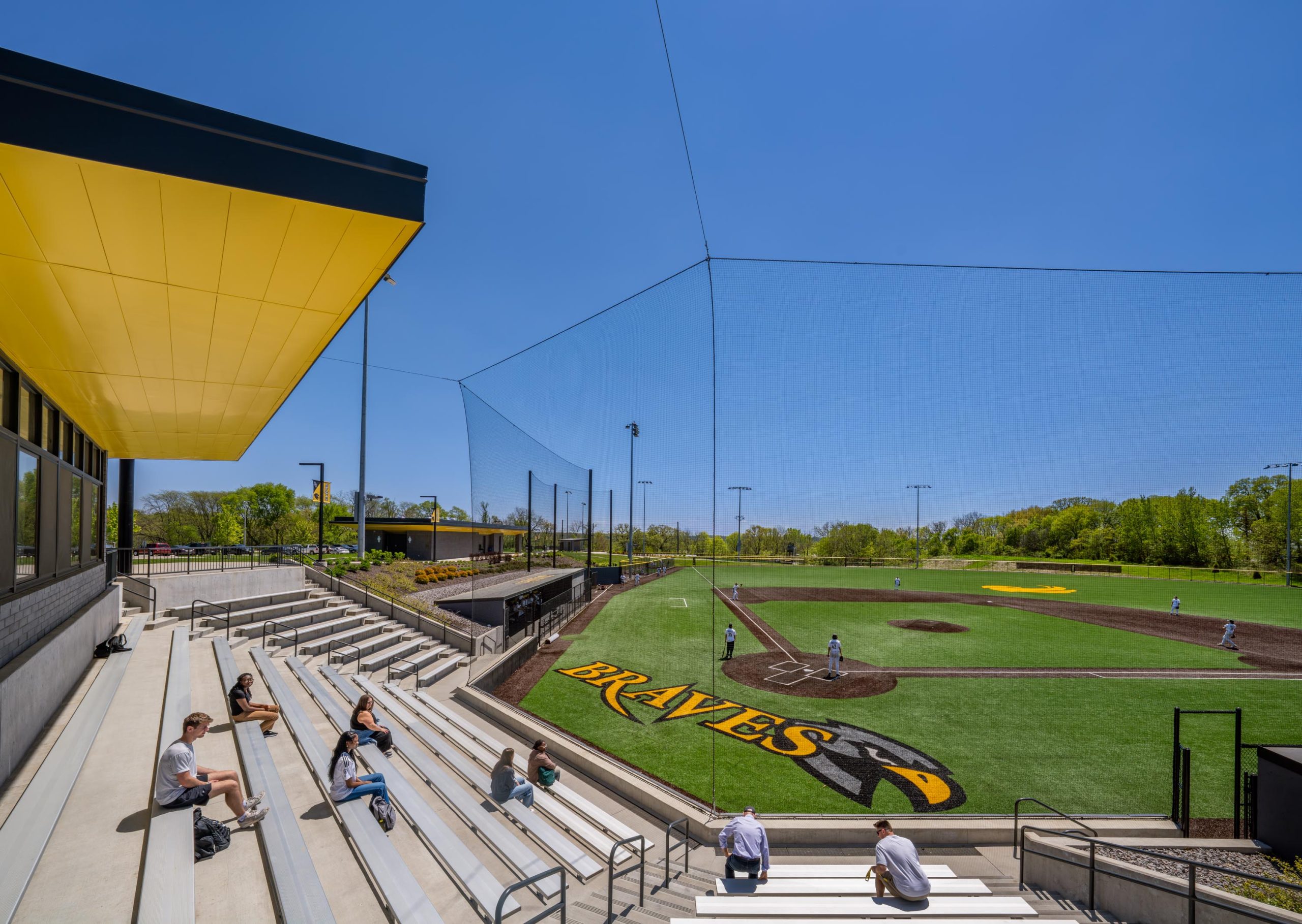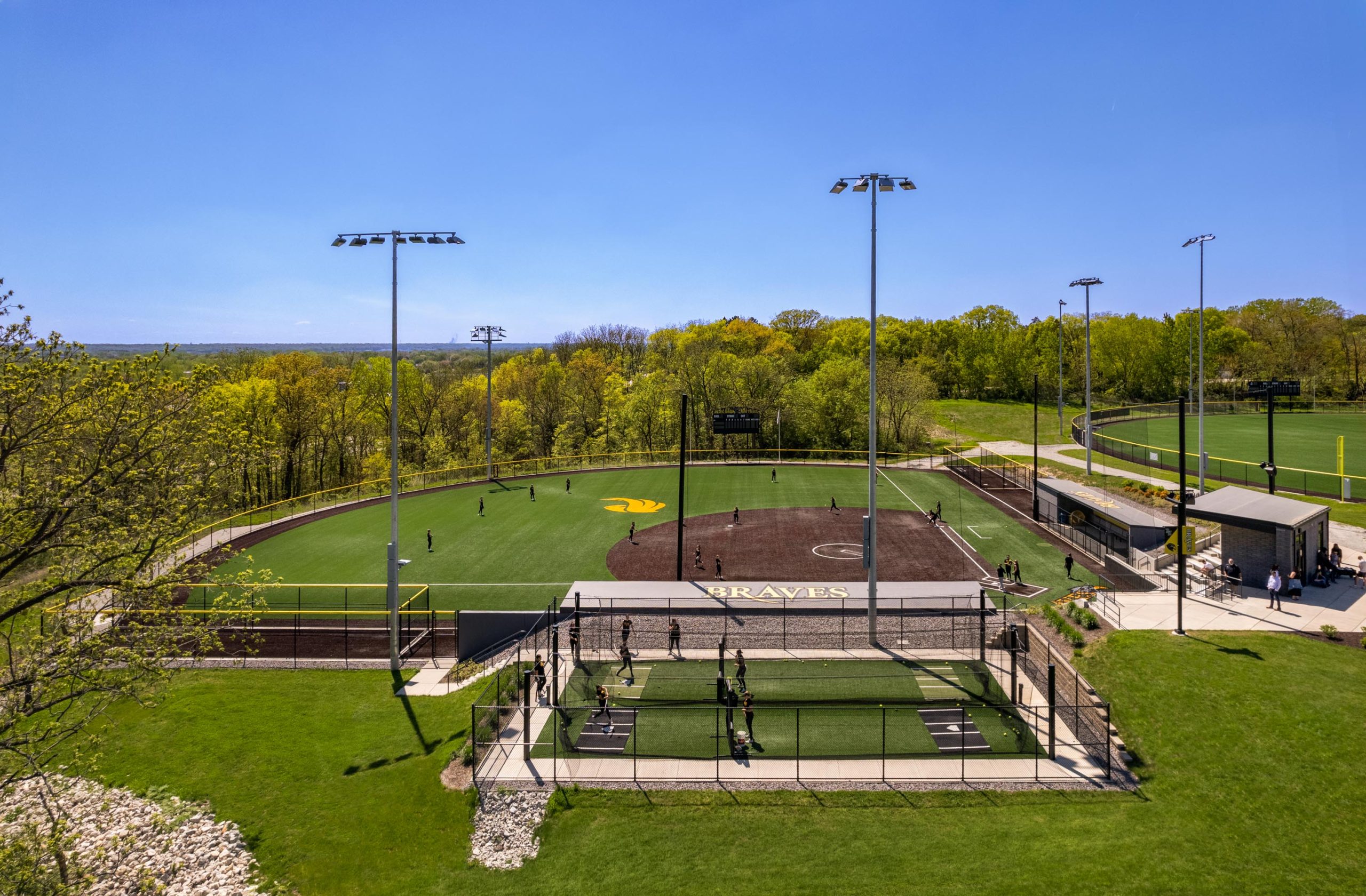 Black Hawk College’s Baseball Stadium features seating for 500 with elevated concourse views and a FieldTurf sand-based surface. The field includes full Musco lighting, a 10-inning scoreboard and a sound system. Players benefit from lighted bullpens, hitting cages and oversized dugouts with overhead storage for up to 60 players. A 14-person press box supports game-day operations and live streaming for fans near and far.