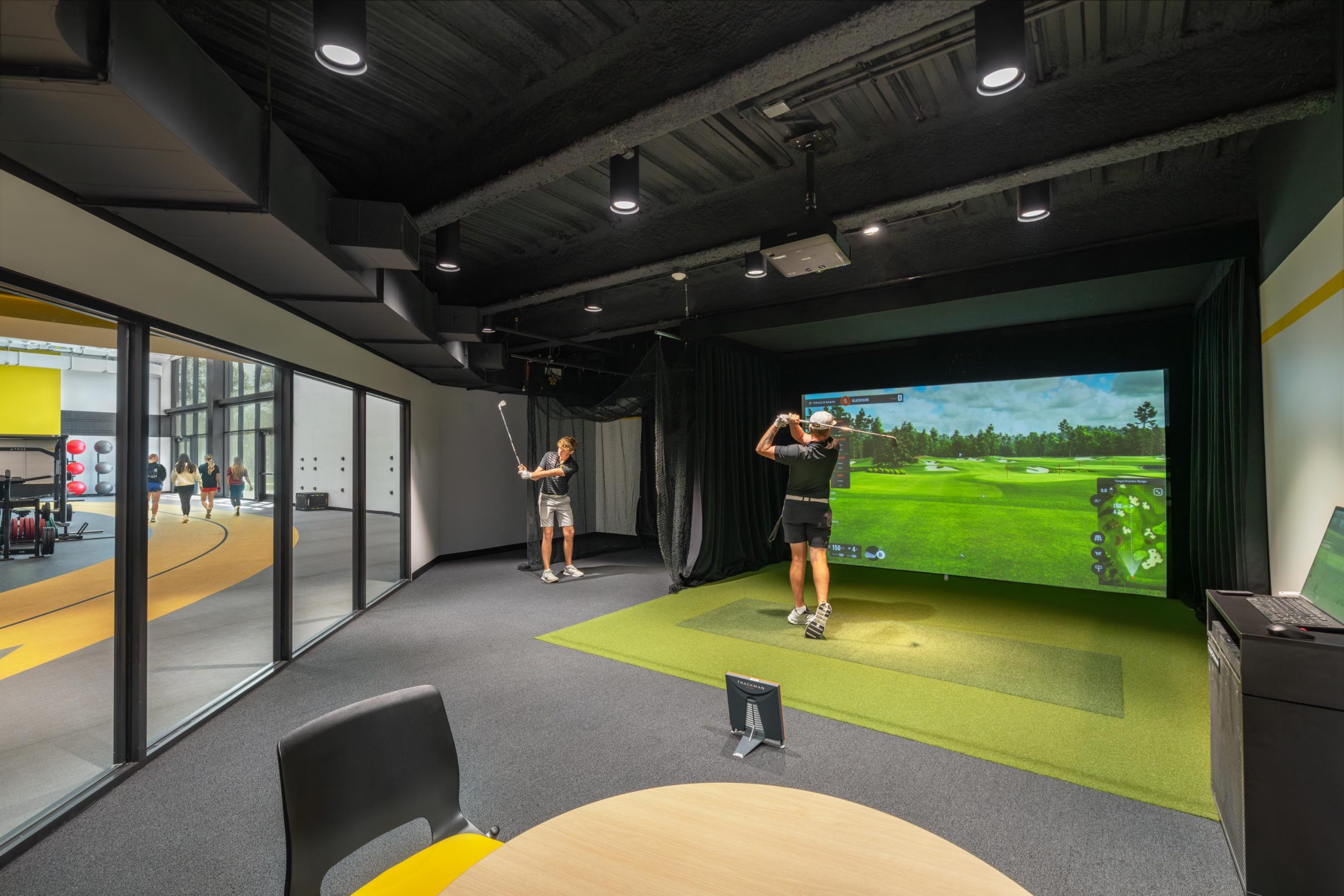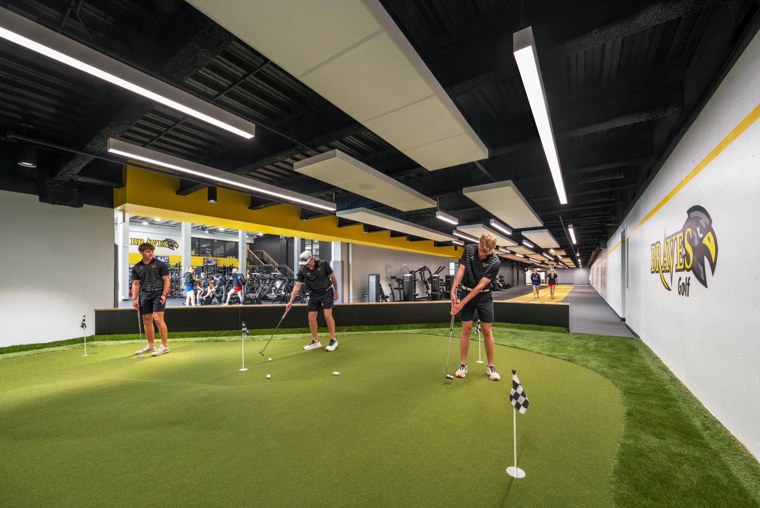 Black Hawk College offers dedicated indoor golf training facilities to support year-round skill development. The Golf Practice Room features a Trackman simulator hitting bay for advanced swing analysis and a secondary bay for additional reps. Nearby, the putting practice area includes an angulating turf green with five pin-placed holes and a chipping zone for short-game precision. These spaces help student-athletes fine-tune their game in a focused, controlled environment.