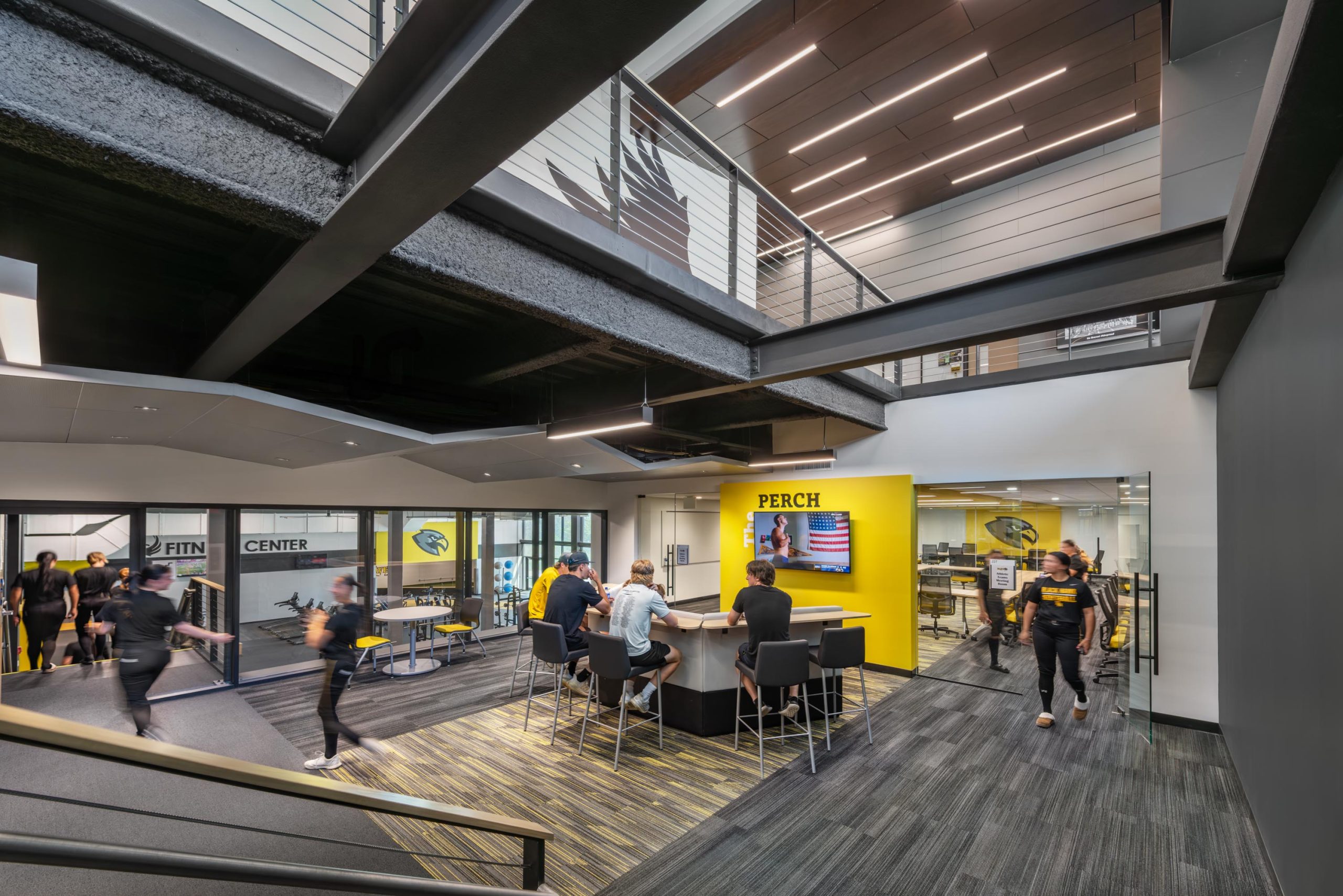 The Perch offers a comfortable lounge for student-athletes with soft furniture and a 60-inch TV. It includes a team meeting room with an 80-inch monitor for presentations and a quiet study area. The recruiting room provides a professional space with a 60-inch screen for visits with prospective athletes and their families.